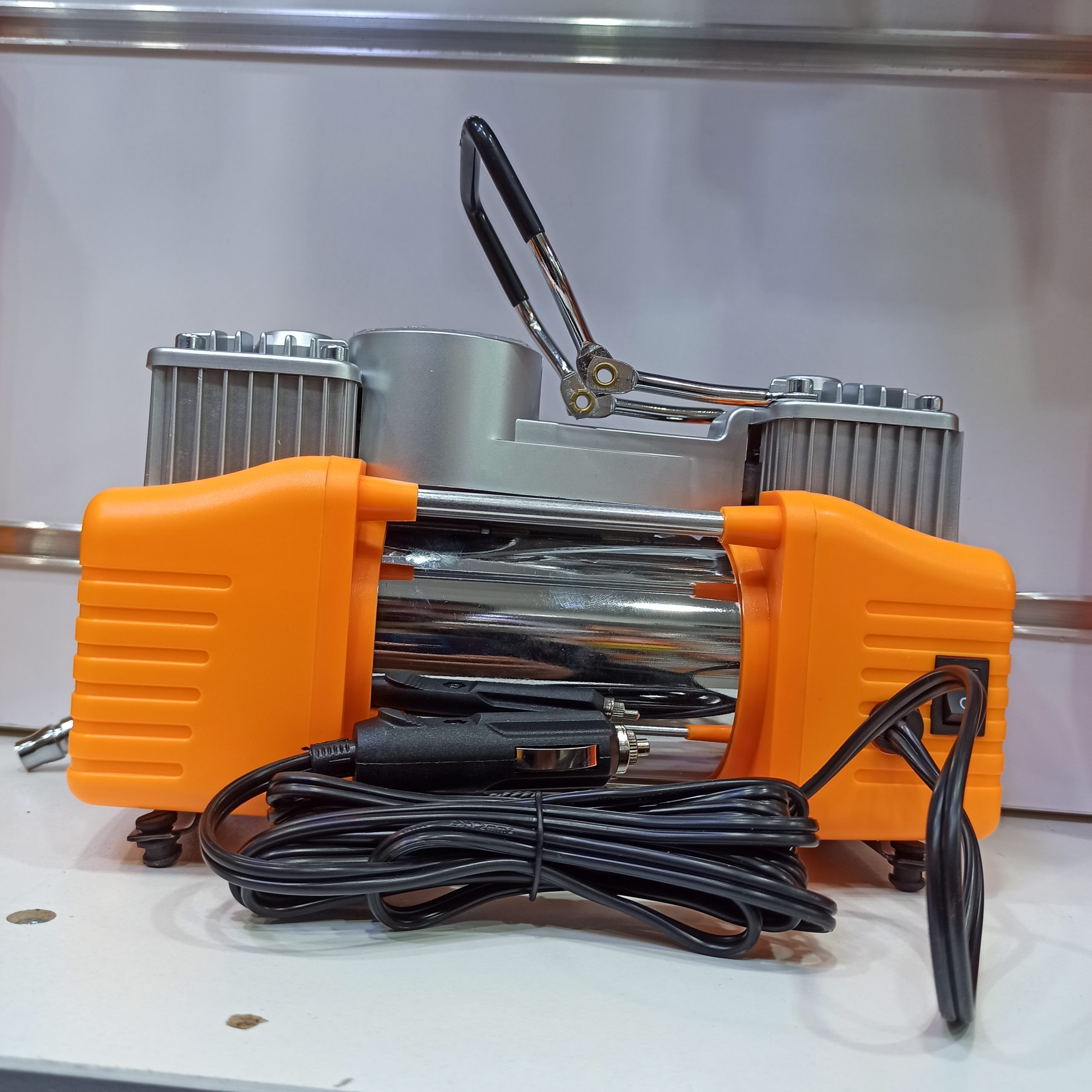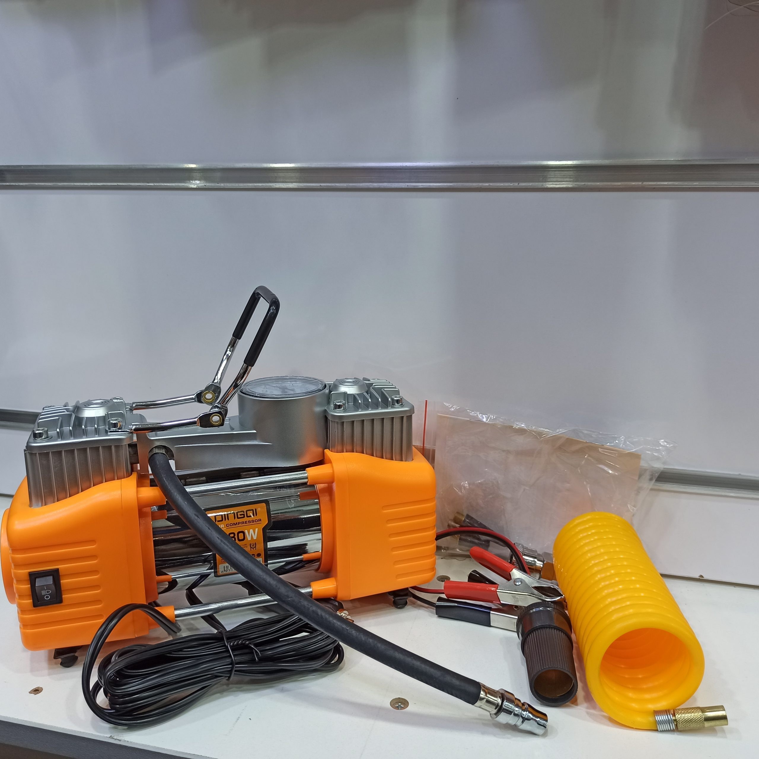 پمپ باد دینگی مدل 108004 یک دستگاه فندکی 12 ولتی با توان 180 وات و دو سیلندر است که برای باد کردن لاستیک خودرو، موتورسیکلت، دوچرخه و توپهای ورزشی طراحی شده است.این پمپ مجهز به گیج فشار (تا 150 PSI)، شلنگ فلزی و چراغ LED است و دبی هوای آن 40 لیتر در دقیقه میباشد .با وجود اینکه این مدل مستقیماً از فندک خودرو (ولتاژ 12–13.8 ولت) تغذیه میشود، در برخی منابع به اشتباه «دارای باتری» ذکر شده؛ در حالی که باتری داخلی ندارد و برای استفاده نیاز به اتصال به منبع 12 ولتی (معمولاً با موتور روشن خودرو) دارد طراحی فشرده، قابلیت حمل آسان و عملکرد سریع آن، این پمپ را به یک ابزار ضروری برای رانندگان و سفرهای جادهای تبدیل کرده است
